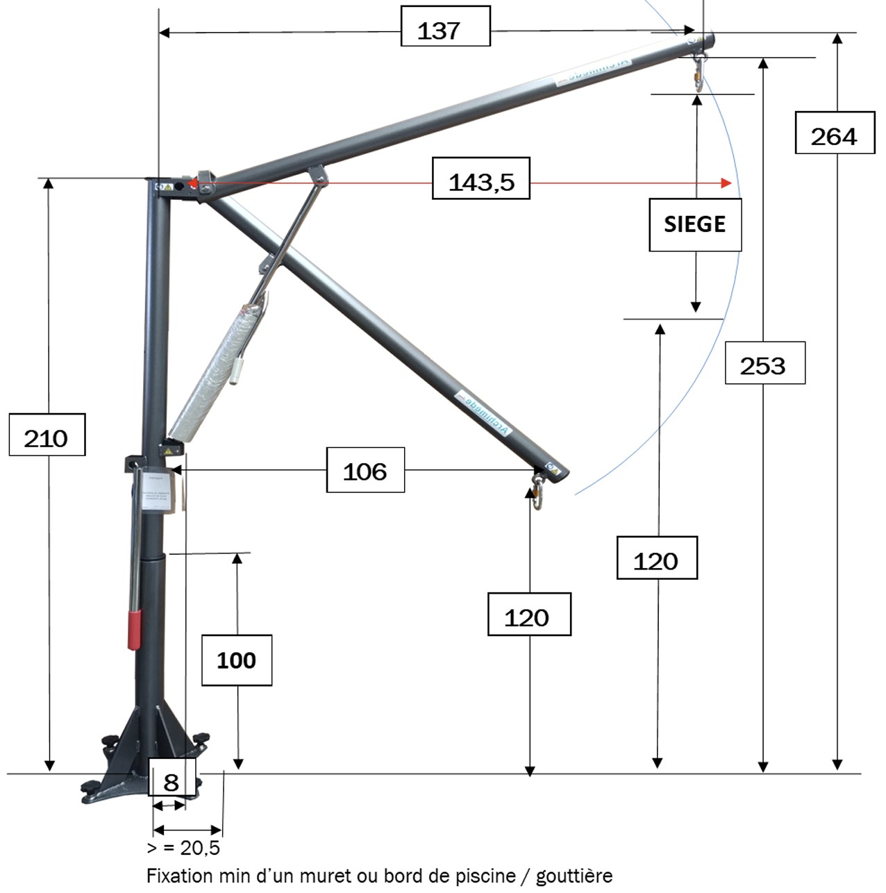 - Constitué d’une colonne pivotante articulée avec une flèche avec un siège SP04 avec repose jambes.